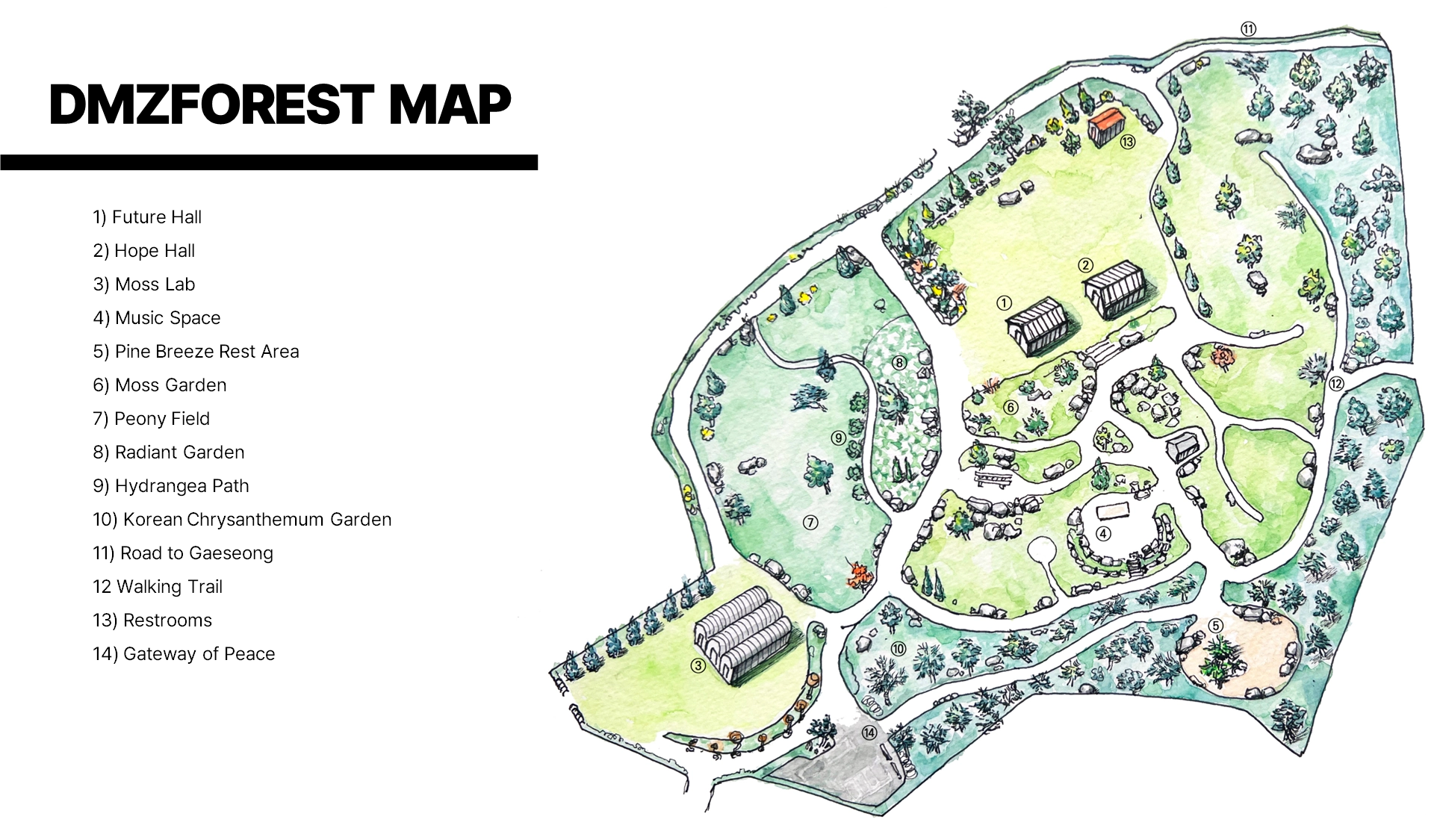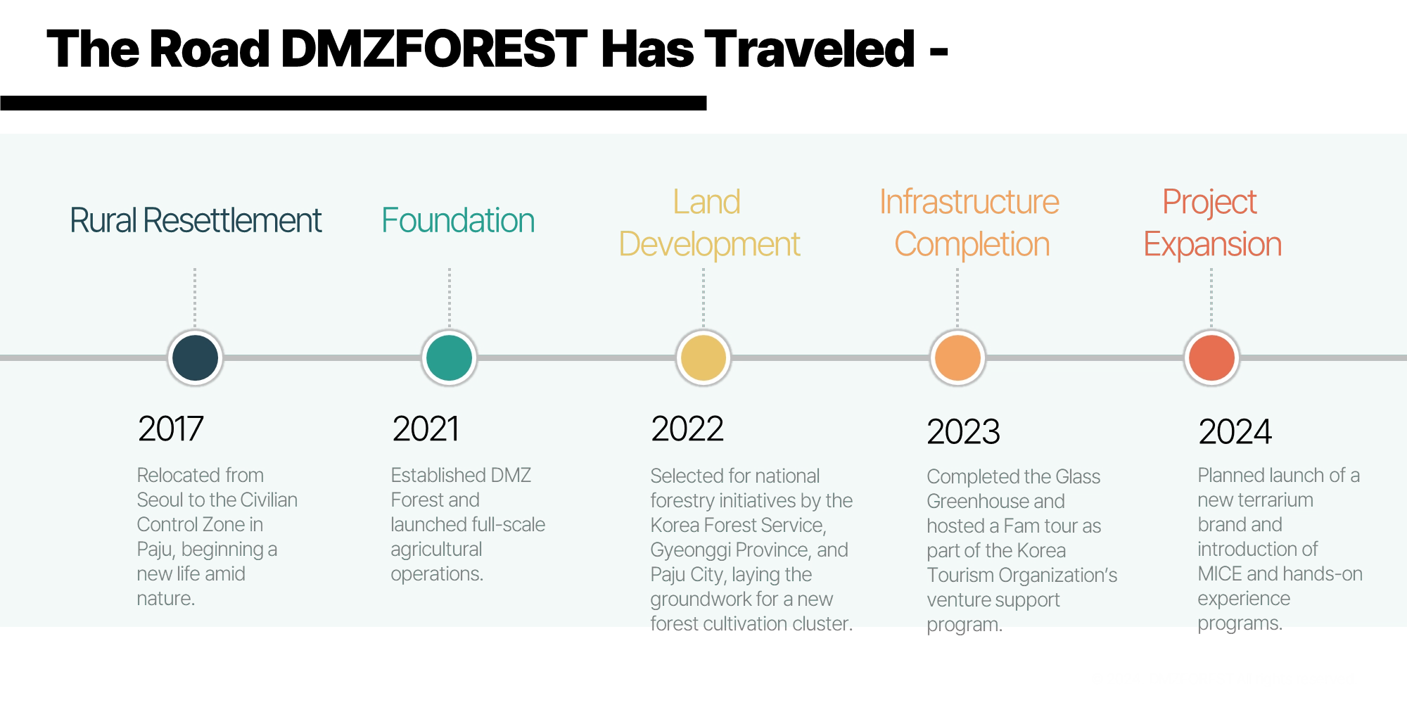 Launched in 2017 by founder Miryeo Lim, DMZFOREST began by restoring and caring for a once‑unvisited hillside forest within the CCZ. Today, it has grown into a unique forest‑culture complex featuring ecological gardens, glass greenhouses, and curated nature-based experiences—connecting forestry & farmingeducation, and wellness.